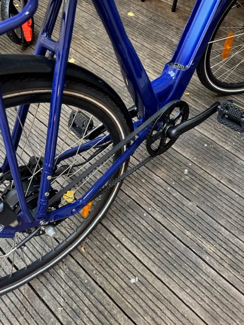 Contrairement à la majorité des vélos électriques, le Folio utilise une transmission par courroie. Ce détail transforme l’usage au quotidien. Plus besoin de graisse, plus de chaîne bruyante, plus de pantalon taché. Le vélo reste propre, silencieux et constant dans le temps.